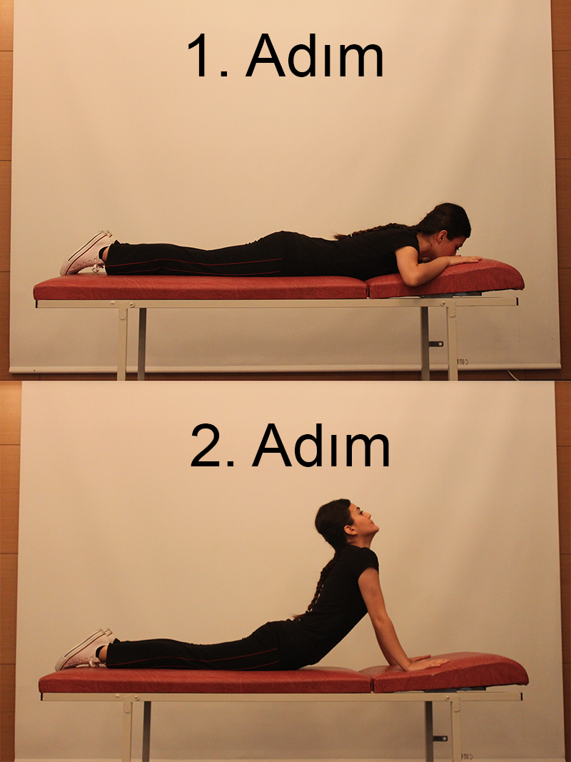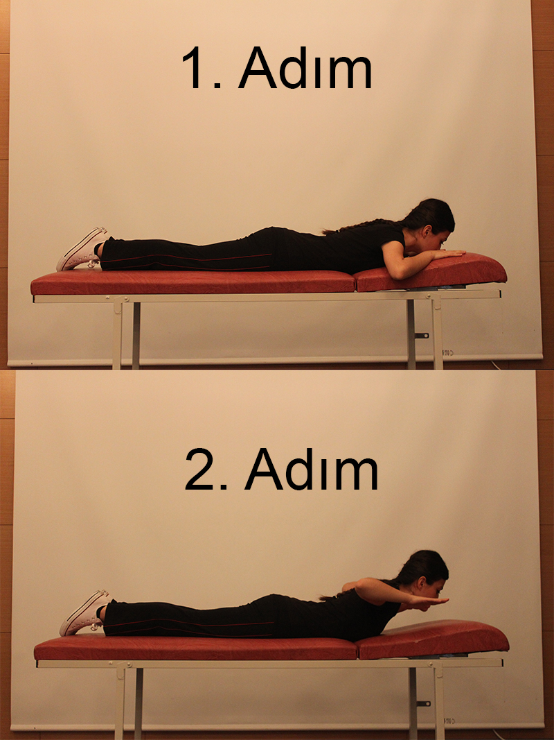 Düz bir zeminde yüzüstü uzanın. Ellerinizi başınızın yanına getirin. Ellerinizden destek almadan başınızı yukarı doğru kaldırıp 5 sn bekleyip tekrar gevşeyin.