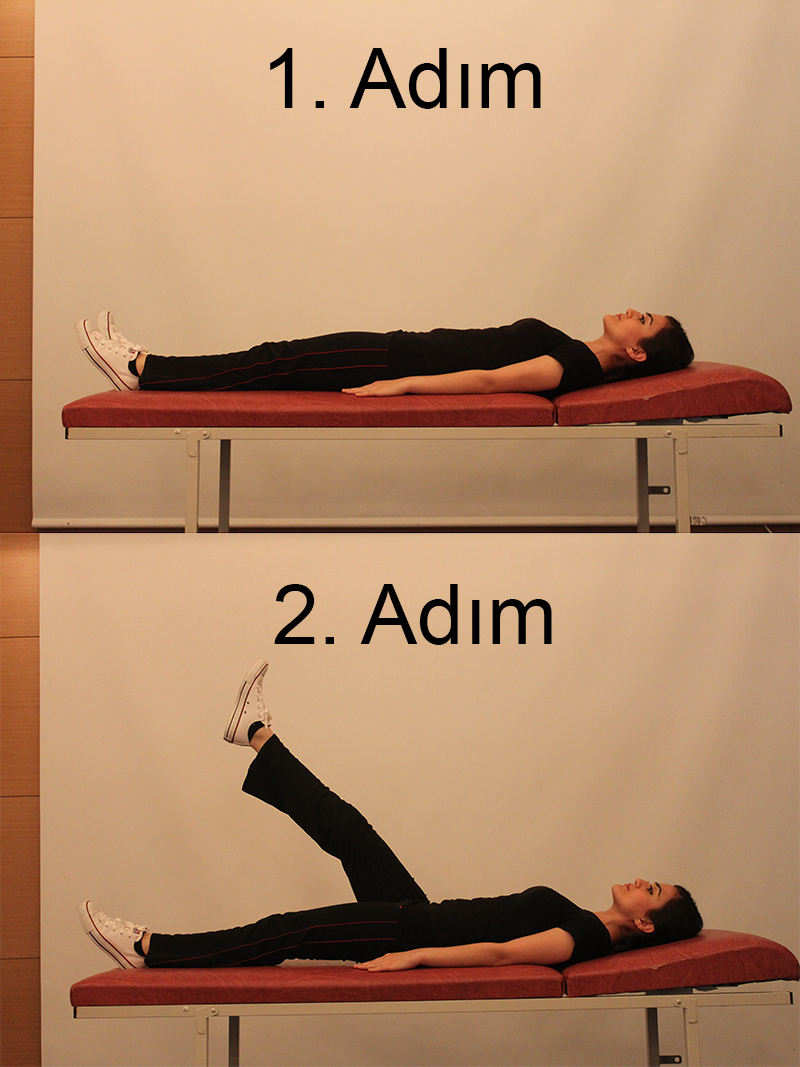 Düz zeminde sırtüstü uzanın. Ellerinizi düz bir destek olarak vücudunuzun yanında tutun. Bir bacağınızı düz olarak dizden kırmadan kaldırın. 5 sn havada tutup tekrar gevşeyin.