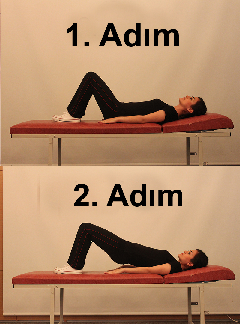 Düz bir zeminde dizler kırılı olarak sırtüstü uzanın. Kollarınızı yanda düz bir şekilde uzatın. Kalça ve bel kaslarından kuvvet alarak belinizi yukarı doğru köprü biçiminde kaldırın. 5 sn bekleyip tekrar gevşeyin.